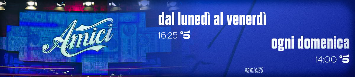 Ultime news News Scopri di più Una nuova tronista! Sara è la nuova tronista di Uomini e Donne! Per conoscerla meglio... 23 Settembre 2025 Vuoi partecipare a #UominieDonne? Ti piacerebbe partecipare a Uomini e Donne? Iscriviti qui: - Per... 09 Settembre 2025 I nuovi tronisti di #UominieDonne sono stati presentati! Uomini e Donne sta per tornare, curiosi di scoprire chi sono i nuovi... 26 Agosto 2025 Scopri chi sono i ragazzi e le ragazze single di Temptation Island Curiosi di sapere chi sono i ragazzi e le ragazze single che... 03 Luglio 2025 Temptation Island: da giovedì 3 luglio Da giovedì 3 luglio in prima serata su Canale 5 ci aspetta un nuovo... 02 Luglio 2025 La finale di #Amici24 – Televoto! Partecipa alla FINALE DI AMICI! Per il TELEVOTO tra BALLERINI... 14 Maggio 2025 #Amici24: ecco i nuovi inediti di Antonia, Jacopo Sol, Nicolò e TRIGNO! Sono disponibili su tutti i digital store i nuovi inediti di Antonia,... 06 Maggio 2025 Testo dell’inedito di Antonia – Relax DELL'OCCHIO MI BASTA E TI CONOSCO CUORE SPEZZATO OCCHI PROFONDO... 06 Maggio 2025 Testo dell’inedito di TRIGNO – D’amore non si muore Siamo in grado di farci bene e di farci del male Non so come fare... 06 Maggio 2025 Testo dell’inedito di Jacopo Sol – Estremo MI SVEGLIO ALLE 3 E FUORI è BUIO MOLTO MENO DI ME SONO CON LEI IN... 06 Maggio 2025 Testo dell’inedito di Nicolò – Un’ora di follia io rancoroso come Dave dei Megadeth Quante ti volte ti... 06 Maggio 2025 I nuovi inediti dei cantanti di #Amici24! Ecco dove ascoltarli… Sono disponibili da oggi, 1 Aprile 2025, tutti i nuovi inediti dei... 01 Aprile 2025